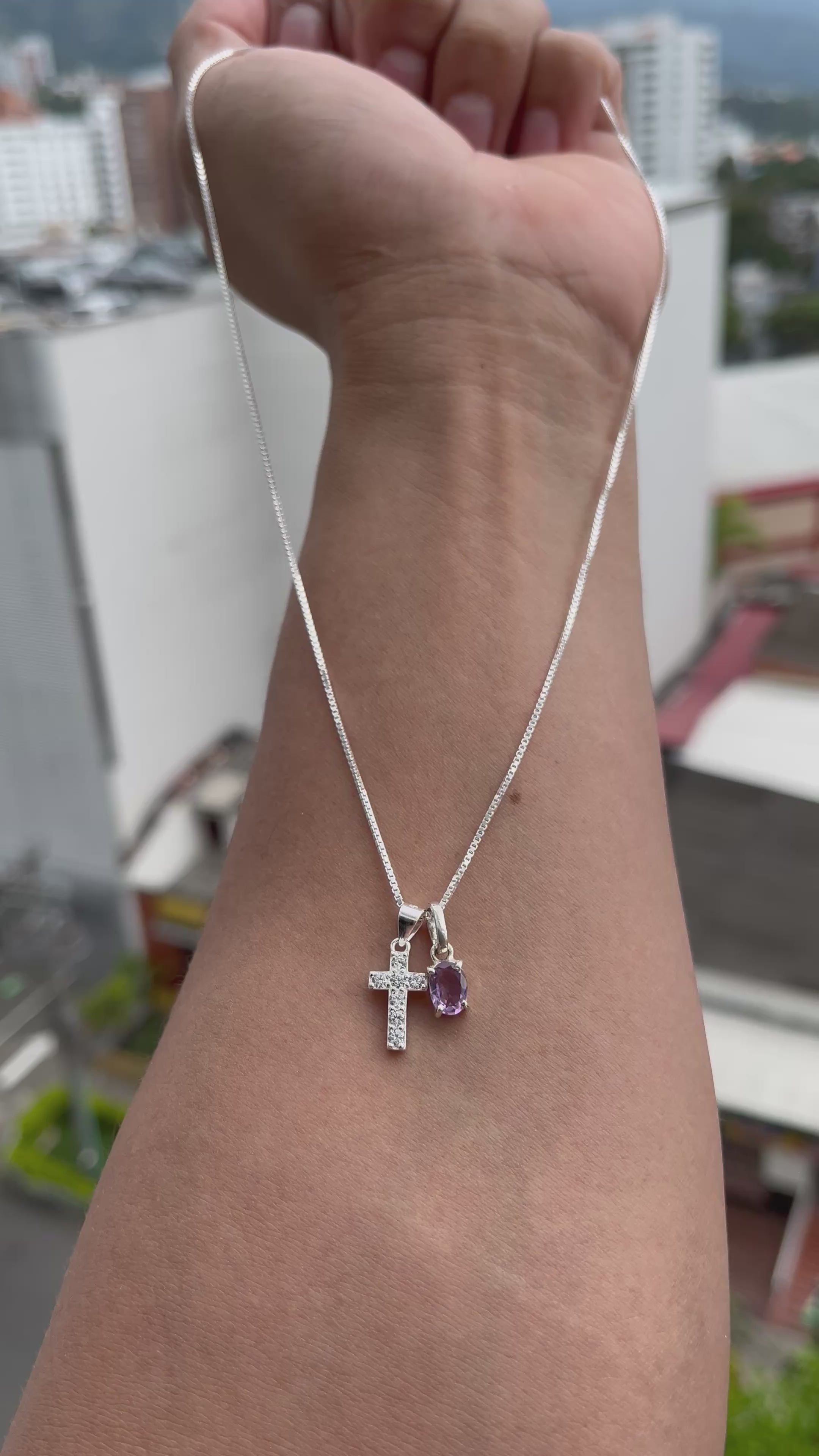 Diseñada sobre una cadena veneciana de 50 cm en plata esterlina 925, Protetto Amatista integra un dije de cruz engastado con zircones de alta precisión, acompañado por una piedra preciosa amatista cuidadosamente seleccionada. El contraste entre la geometría pura de la cruz y la profundidad cromática de la amatista crea un equilibrio sutil entre fuerza, protección y elegancia.